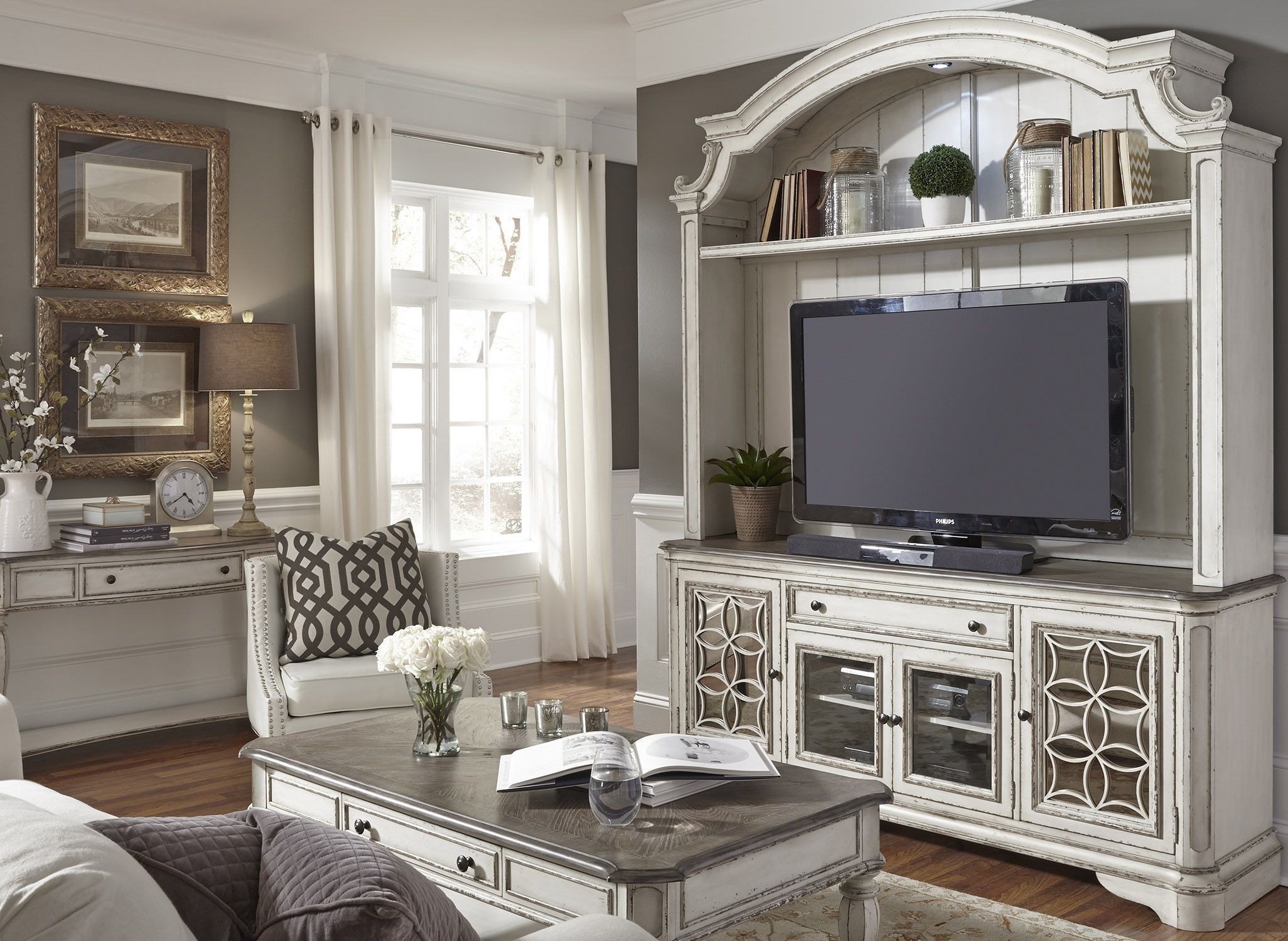 Magnolia Manor Antique White Entertainment Center from Liberty Magnolia Manor Antique White 1 Drawer Nightstand transform your bedroom into an elegant getaway with the magnolia manor nightstand. featuring one fully finished dovetail drawer with metal full extension glides, this piece also includes a bottom shelf for more easy access storage. featuring one fully finished dovetail drawer with metal full extension glides, this piece also includes a bottom shelf for more. Featuring a. Magnolia Manor Antique White 1 Drawer Nightstand.