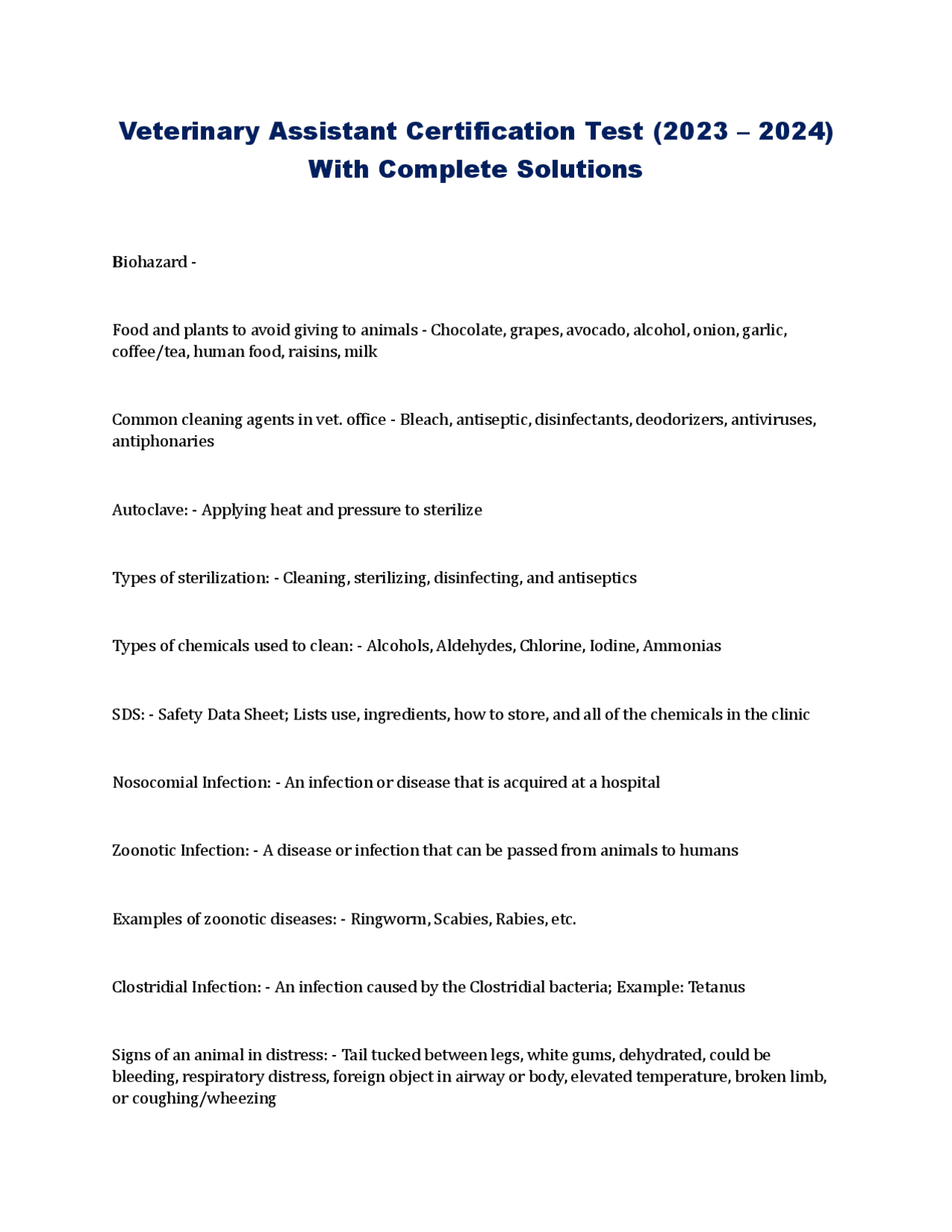 Veterinary Assistant Certification Test (2023 2024) With Complete