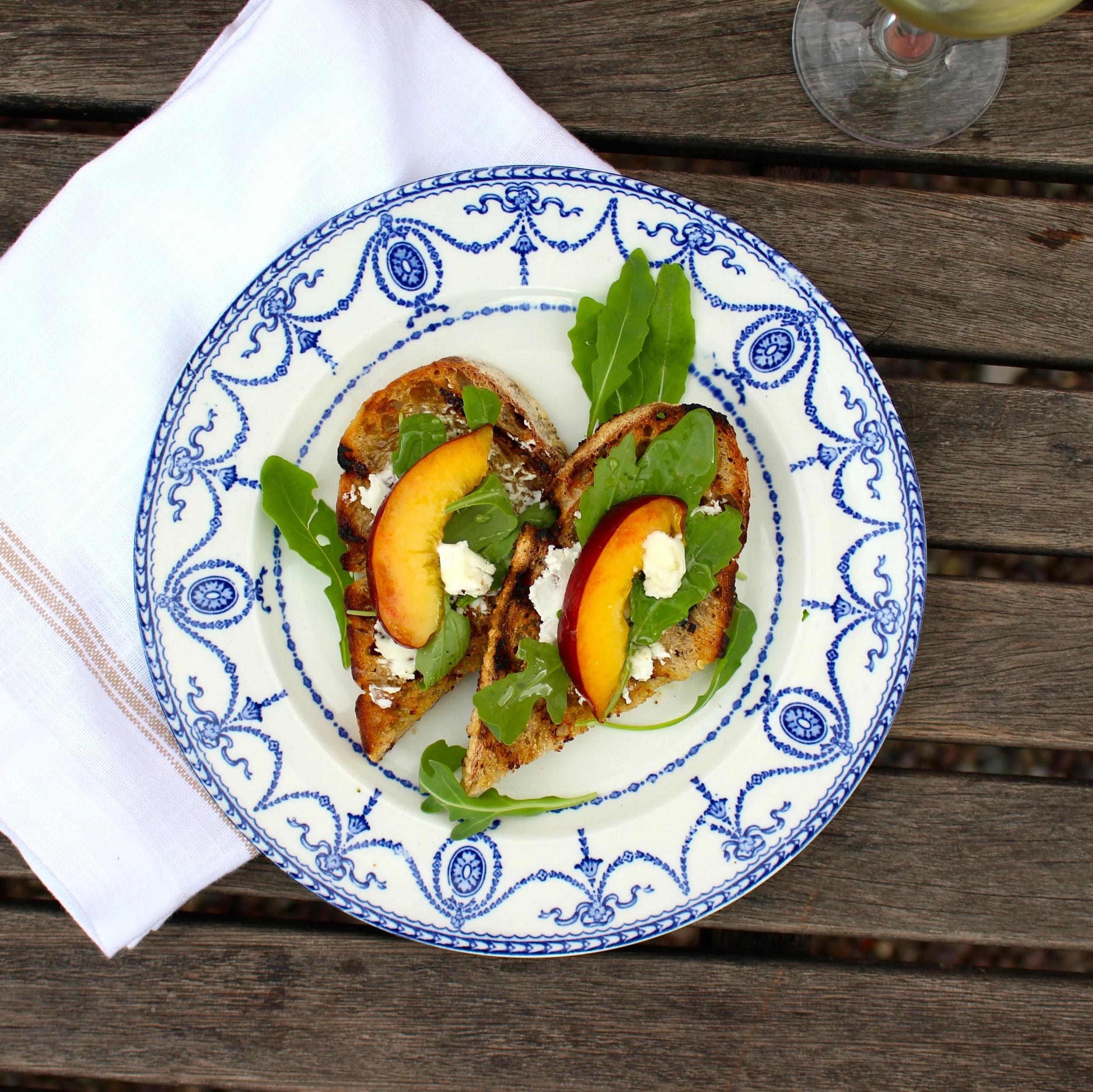 Bruschetta with Goat Cheese, Peaches and Arugula