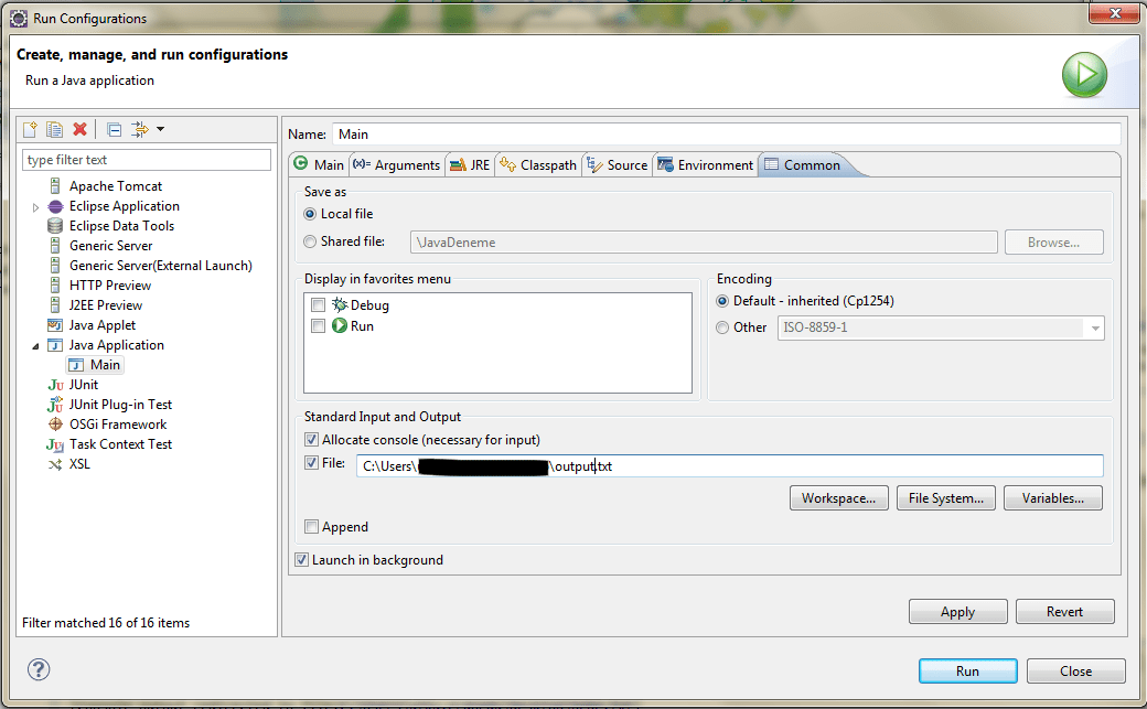 Currently by default, it shows the output in the console. How can we redirect the eclipse console output to a file? Under standard input and output: Write a java program as usual. Select output file checkbox, enter. In the dialog, select your java project, then select the common tab. Another approach is to modify your java program to redirect its output to a file. Paste the contents and save the file. Then under standard input and output section, click on checkbox. I'm doing a java project using eclipse.