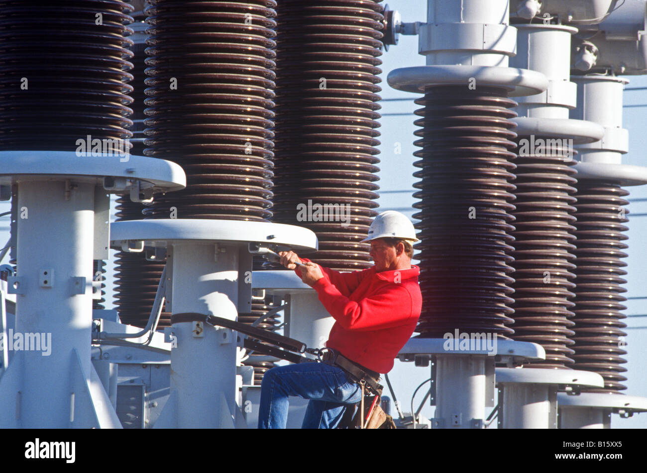 Electrical worker repairs power lines at an electrical substation Stock