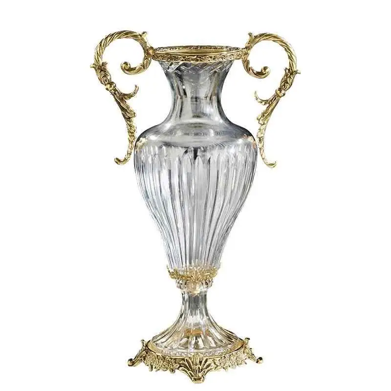 European Exquisite Golden Eared Crystal Vase Brass Base Luxury