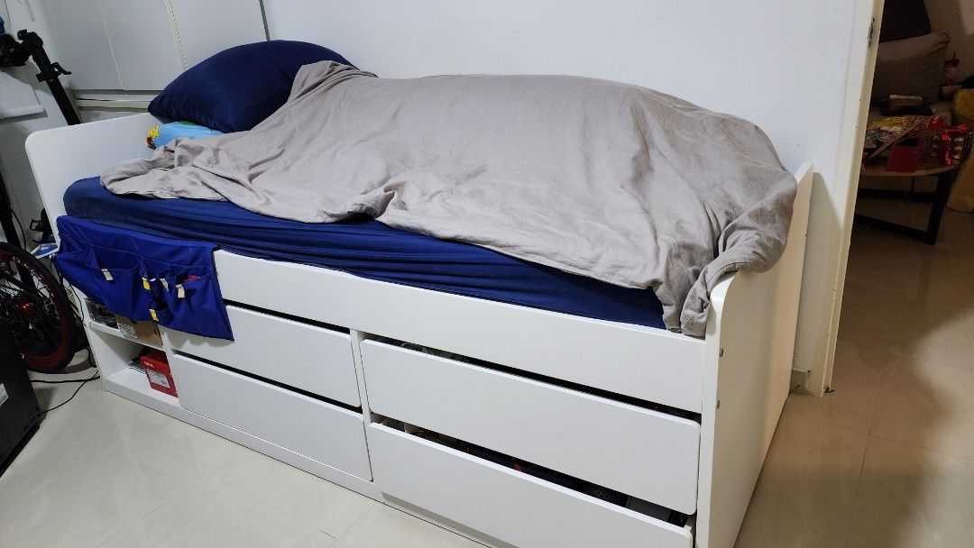 Bed Ikea Slakt A nice bed with lots of storage that swallows up everything. The slakt bed matches what i need the best. The bed is the main piece, and it has a lot of room underneath. It turns out that the arm rail doesn't actually fit with this bed but will fit on other beds. Släkt bed frame w/storage+slatted bedbase, white, twin. Bed Ikea Slakt.