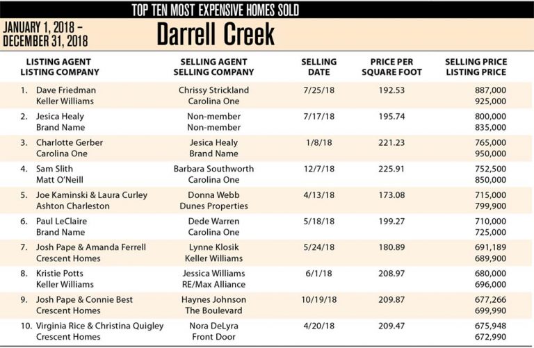 Darrell Creek, Mt Pleasant Top Ten Most Expensive Homes Sold in 2018