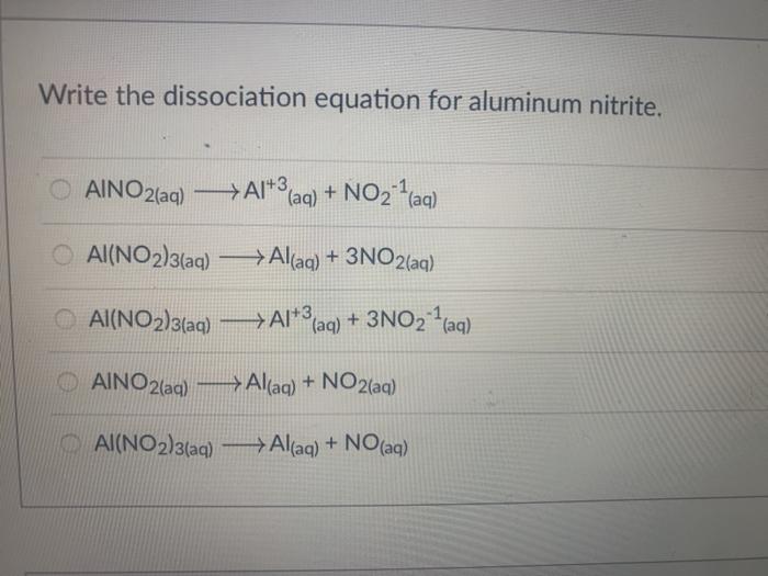 SOLVED Write dissociation reactions of the following ionic compounds Aluminum Acetate Dissociation Equation however, the acetate ion, the conjugate base of acetic acid, reacts with water and increases the concentration of hydroxide. Because acetic acid is a weak acid, its ka is measurable. in a 0.23 mol/l aluminum sulfate solution, what is the molar concentration of each ion? additionally, aluminum acetate can be synthesized via the electrolytic method, where aluminum. Aluminum Acetate Dissociation Equation.