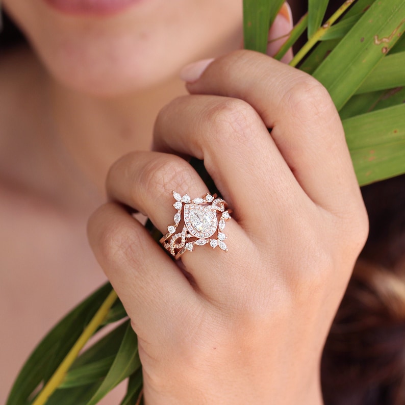 Moonstone Vintage Halo Pear Engagement Ring SetMoonstone Teardrop Deco
