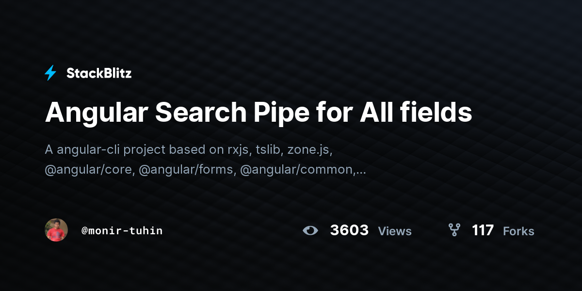 Angular Filter Pipe Example Stackblitz at Patty Katz blog Search Filter Pipe In Angular Stackblitz Starter project for angular apps that exports to the angular cli. In order to use the pipe, first we need to import it into the app module. The pipe has inbuilt count feature to calculate the records searched. Below the import appcomponent statement, import the filter pipe: Check out this post and also learn about pipes and directives along with. Search Filter Pipe In Angular Stackblitz.