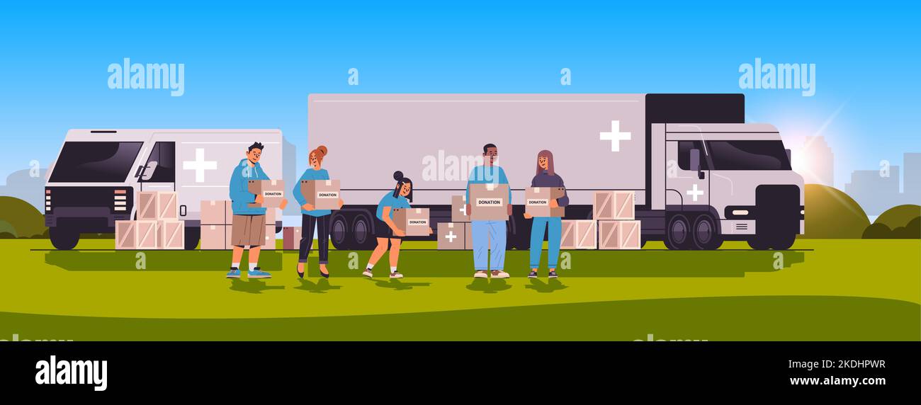 people loading donation help boxes with medical supplies humanitarian