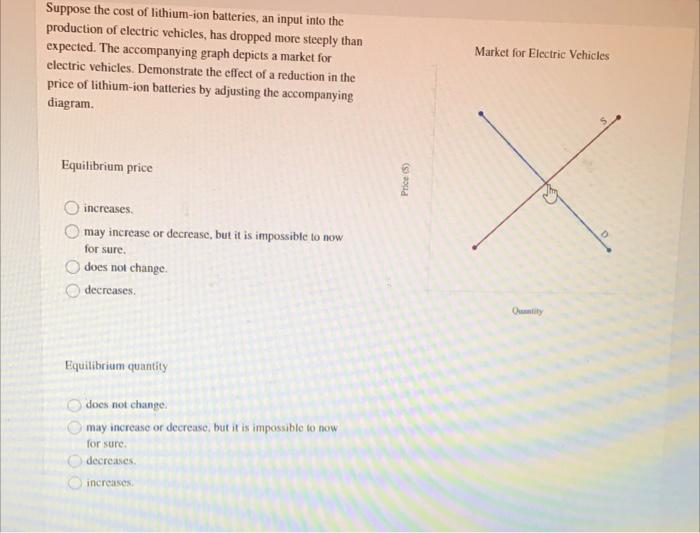 Solved Suppose the cost of lithiumion batteries, an input Electric Vehicles Quizlet higher cost, stricter design requirements, need for protective circuitry. what are the three primary electrical concepts to understand regarding electrified vehicles? Does that tesla qualify for a tax credit? how long does it take an ev to charge? do you know electric vehicles as well as you think? Test your ev knowledge with sample questions from. Electric Vehicles Quizlet.