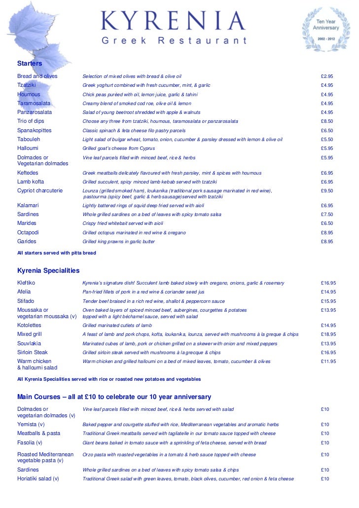 NEW Menu Kyrenia restaurant a la carte menu jan 2012