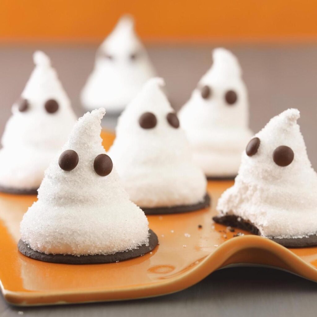 Marshmallow Ghost Cookies Recipe Marshmallow Ghost Cookies and to make your own marshmallows, check out my easy recipe for homemade marshmallows as well as other marshmallow based treats like my easy homemade marshmallow fondant. one by one, dip the bottoms of the marshmallows into the icing and place onto the centres of a cookie to secure in place. Using a spoon, pour the white. . Marshmallow Ghost Cookies.