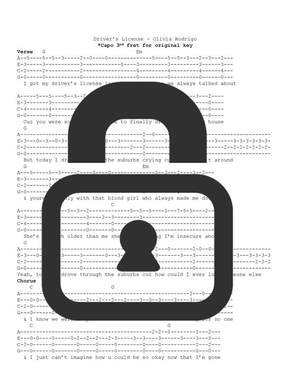 "drivers license Olivia Rodrigo" Fingerstyle Ukulele Tab Sheet Ukulele Chords Drivers License Ukulele chords and tabs for driver's license by olivia rodrigo. Easily playable chords with tab for sections of the. 23,590 views, added to favorites 191 times. Ukulele chords and tabs for drivers license by olivia rodrigo. Drivers license ukulele tablature by olivia rodrigo, chords in song are g,em,c,d,d/b,c6. [bb], [gm], [d#], [d#m] are the ukulele chords for playing drivers license. Ukulele Chords Drivers License.