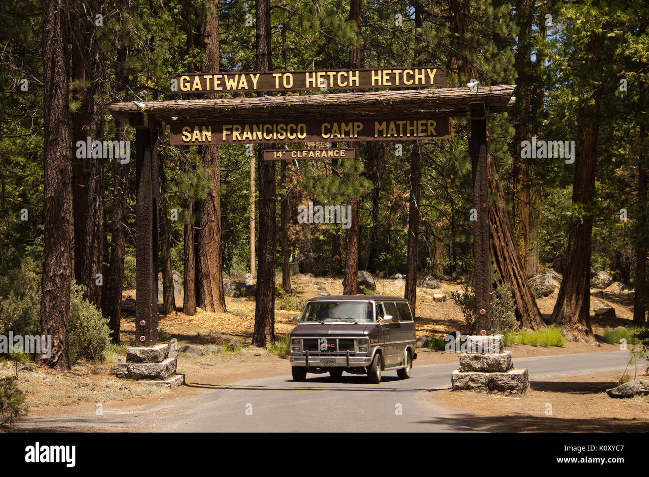 A GMC van driving through the gateway to Hetch Hetchy near San