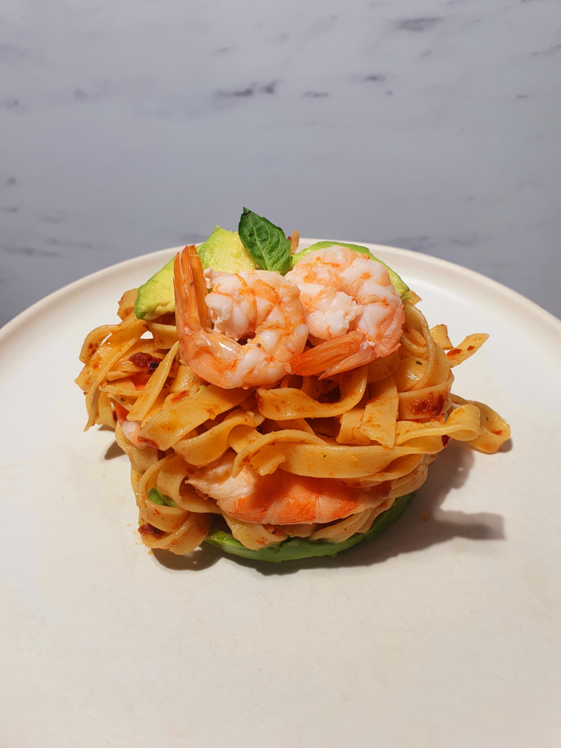 Nido de Tagliatelle con Pesto alla Trapanese y langostinos MesClar
