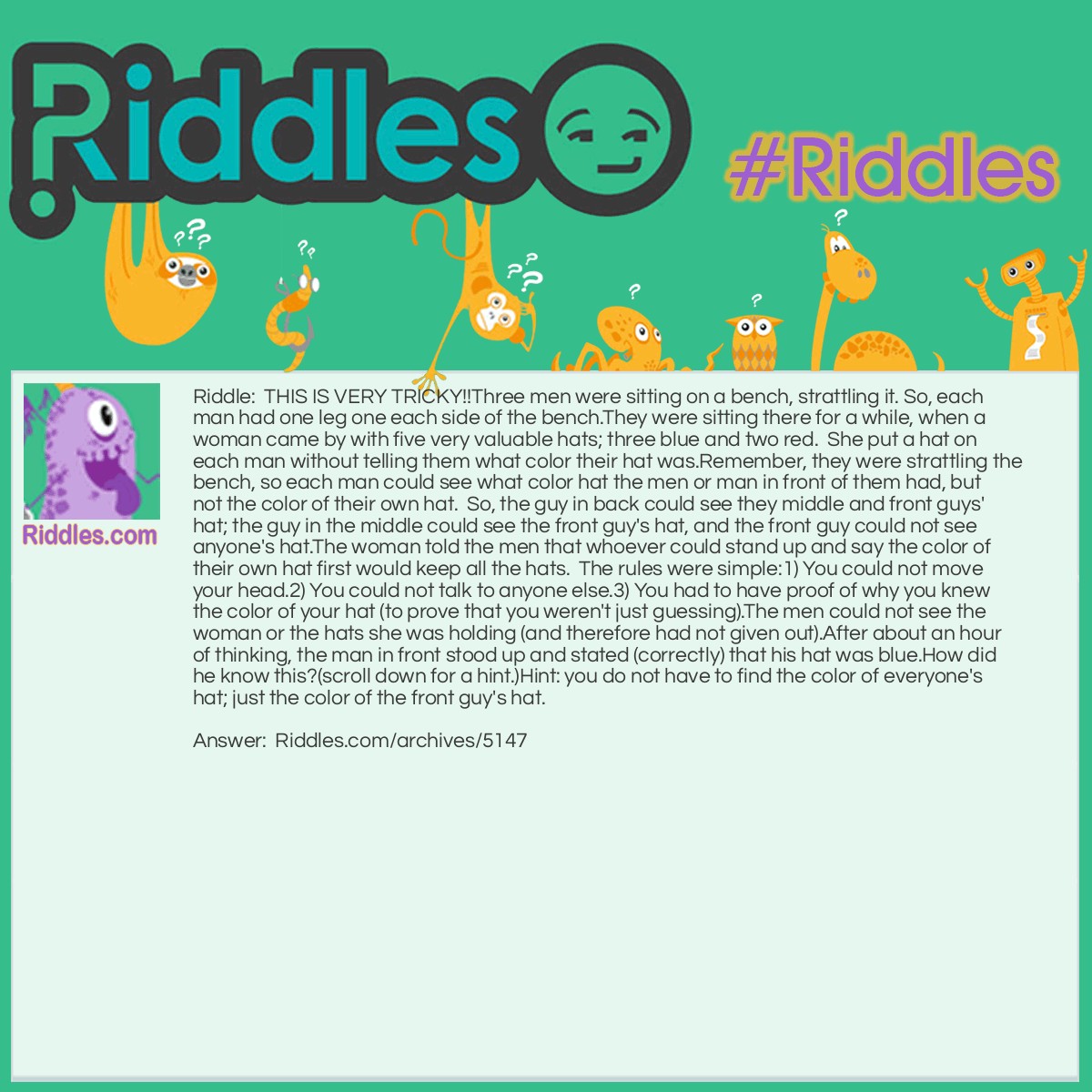 4 Prisoners Hat Riddle Truth Inside Of You Hat Jokes And Riddles We have gathered 100 funny hat jokes, hilarious one liners, and the best hat puns to cheer you up. These hat jokes are perfect for both children and adults to enjoy! Are you looking for some funny hat jokes? Each joke is punny and perfect to share with family. The funniest puns and jokes about hats that you will ever. Hat Jokes And Riddles.