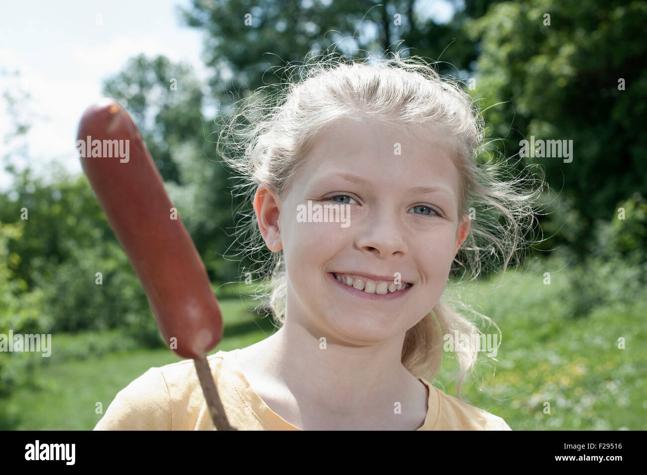 Girl holding sausage and smiling, Bavaria, Germany Stock Photo Alamy