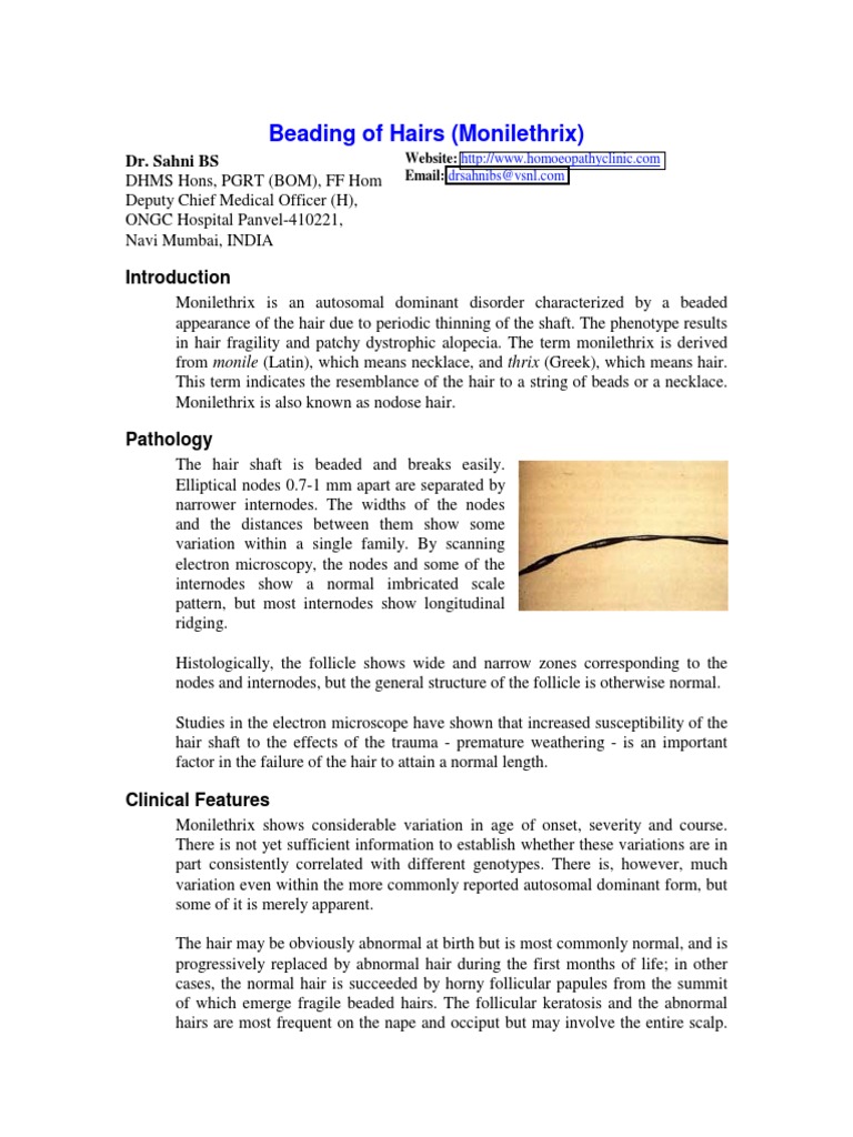 Monilethrix (spindle shaped hair, beaded hair) Beaded Hair Monilethrix Monilethrix is a rare inherited disorder characterized by sparse, dry, and/or brittle hair that often breaks before reaching. Its most characteristic feature is that individual strands of hair have a beaded appearance like the beads of a necklace. Monilethrix is a condition that affects hair growth. Its most characteristic feature is that individual strands of hair have a beaded. Monilethrix. Beaded Hair Monilethrix.