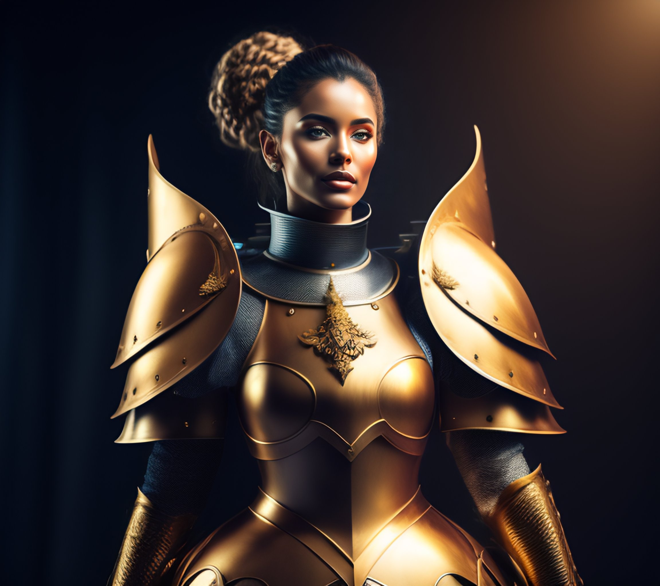 Lexica Female knight wearing golden armor slim waist hands on chest