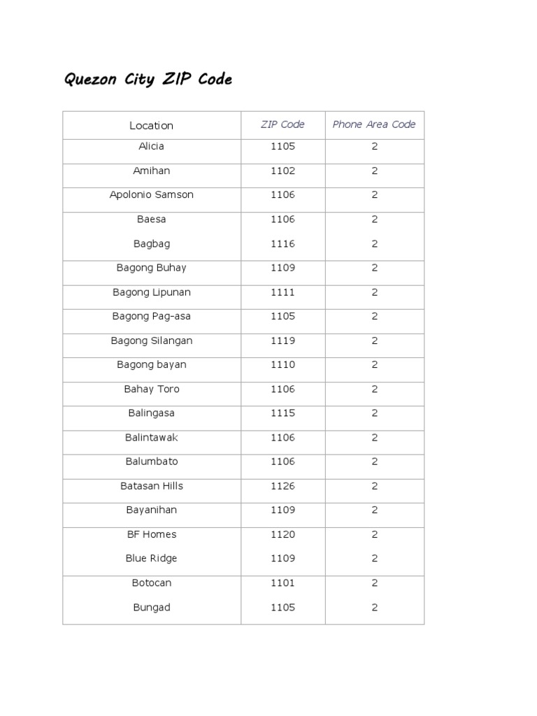 Here are the postal codes (zip codes) and area codes of locations in. In fact, the actual address is read only at the final post office where they do the final sorting for delivery. 149 rows quezon city zip codes, postal codes, and phone area codes. Quezon city zip codes, postal codes, and area code. Thus postal or pin code helps post offices to speed up the sorting and delivery of mails. Check here for complete zip codes of quezon city. The zip code of quezon city philippines ranges from 0800 to 1147. It is situated relatively in the high plateau of the. 146 rows here is the complete and updated list of quezon city zip code or postal code from the philippine postal corporation (phlpost). Quezon city zip code phone quezon city area code alicia 1105 2 amihan 1102 2 apolonio samson 1106 2 baesa 1106 2 bagbag 1116 2.