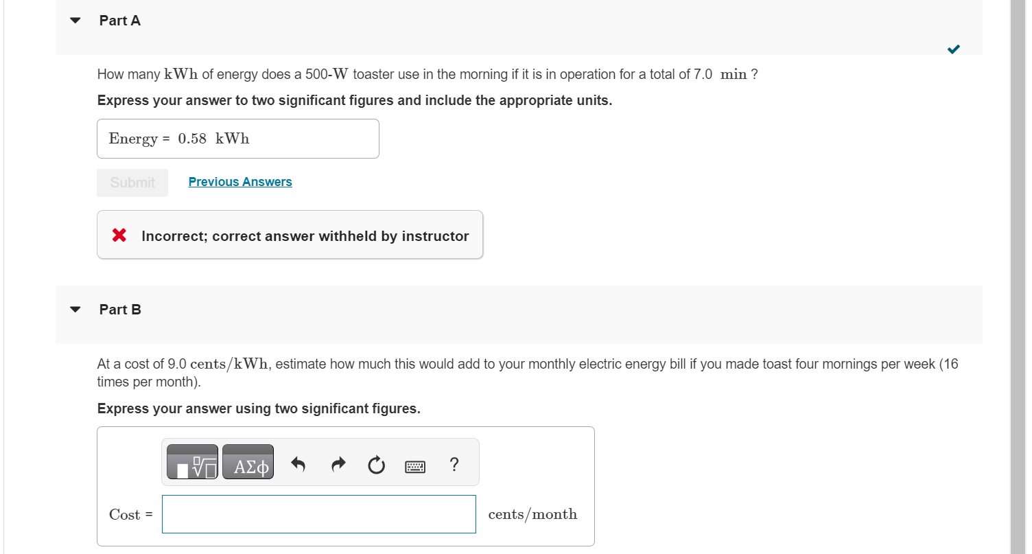 Solved How many kWh of energy does a 500−W toaster use in