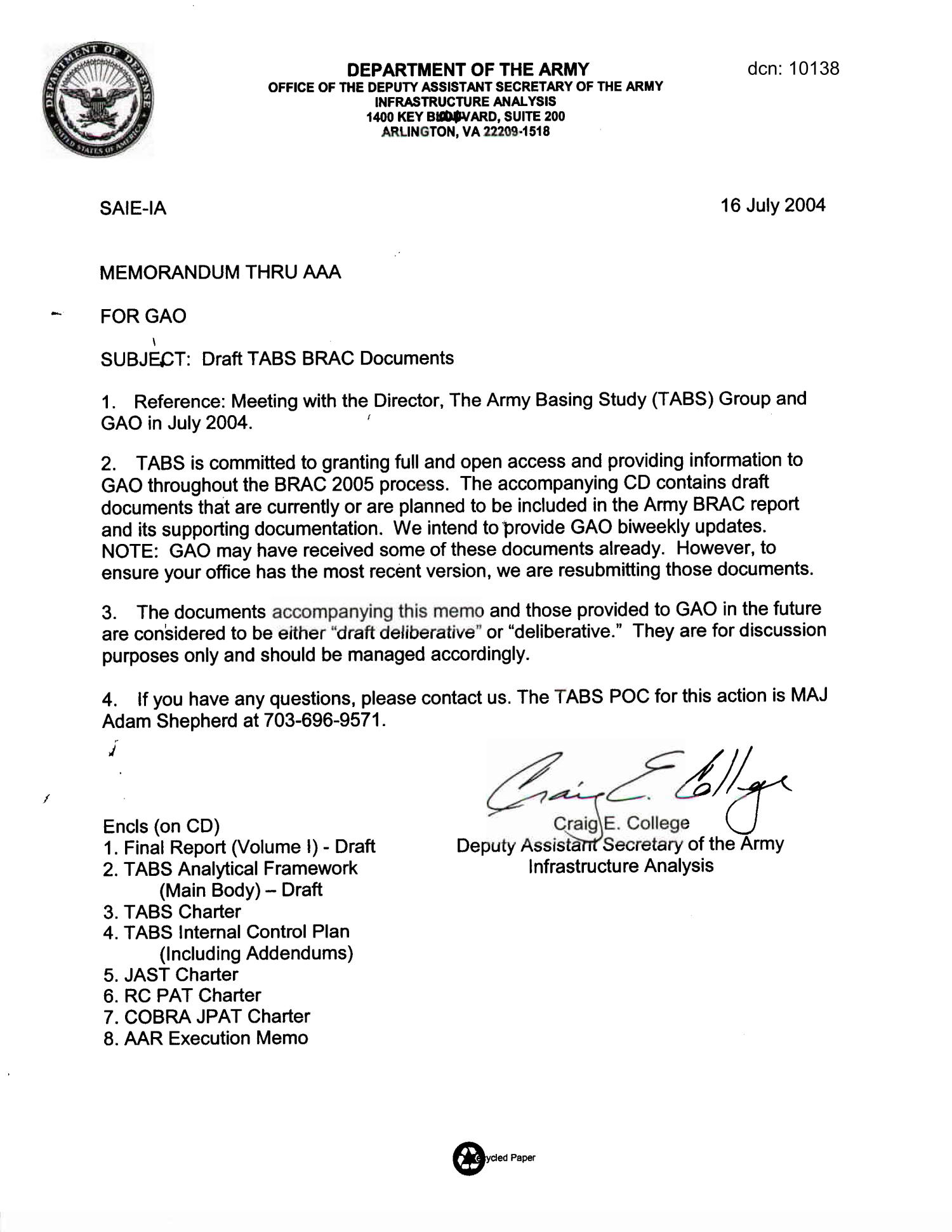 Army Joint Coordination Memorandum GAO Submission 040716 16 July