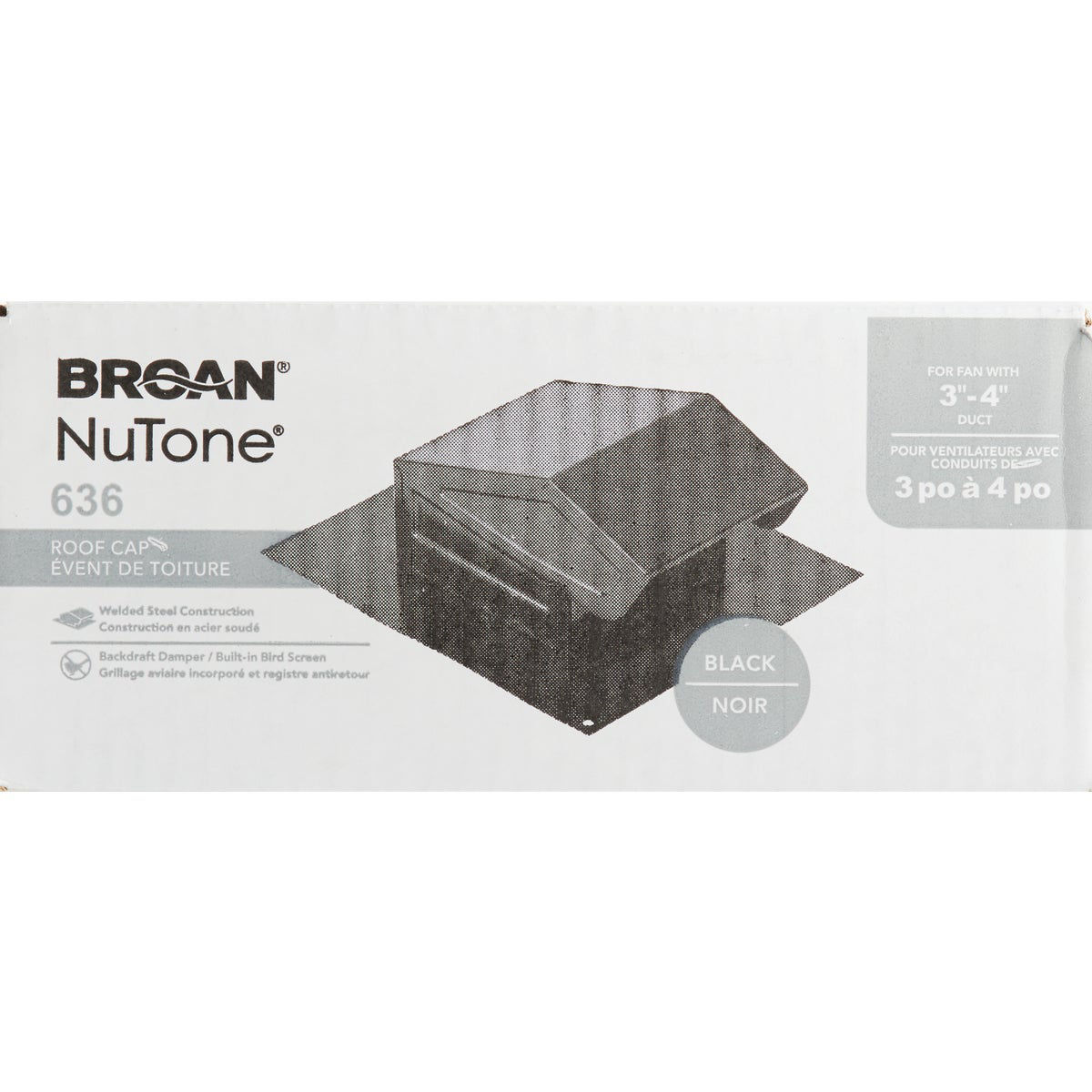 Broan NuTone Roof Vent Cap 636 for fans w/ 3", 4" ducts NEW FREE Broan Nutone Roof Cap Round duct roof cap with manufactured steel housing and black electrically bonded epoxy finish. Features a black enamel finish and is designed for use. Features a black enamel finish and is designed for use with 3 in. This cap provides reliable roof top ventilation and features both a back draft damper and bird screen, preventing outside air from entering the. Broan Nutone Roof Cap.