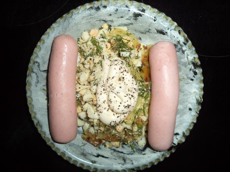 Boiled Sausages with Salad, Mayonnaise and Spices Stock Image Image