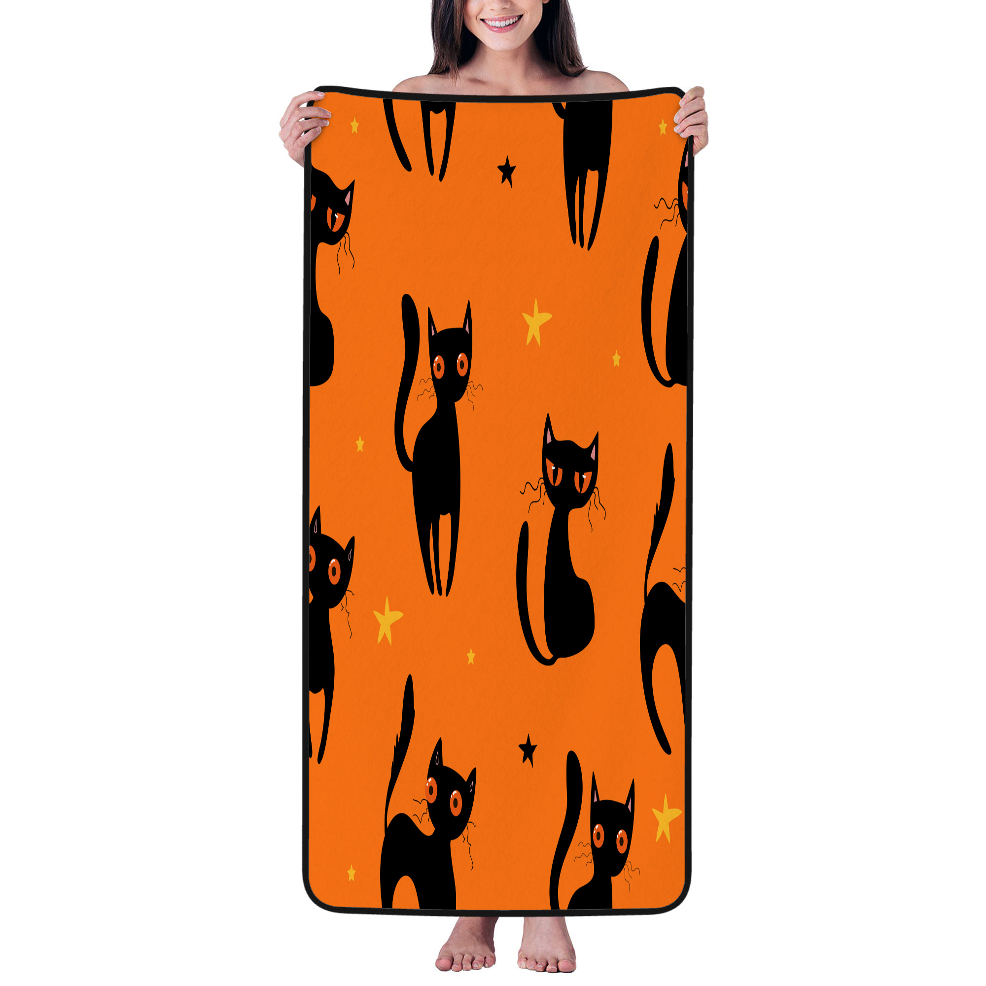 27x55in Coral Velvet Bath Towels Halloween Black Cat With Yellow Eyes