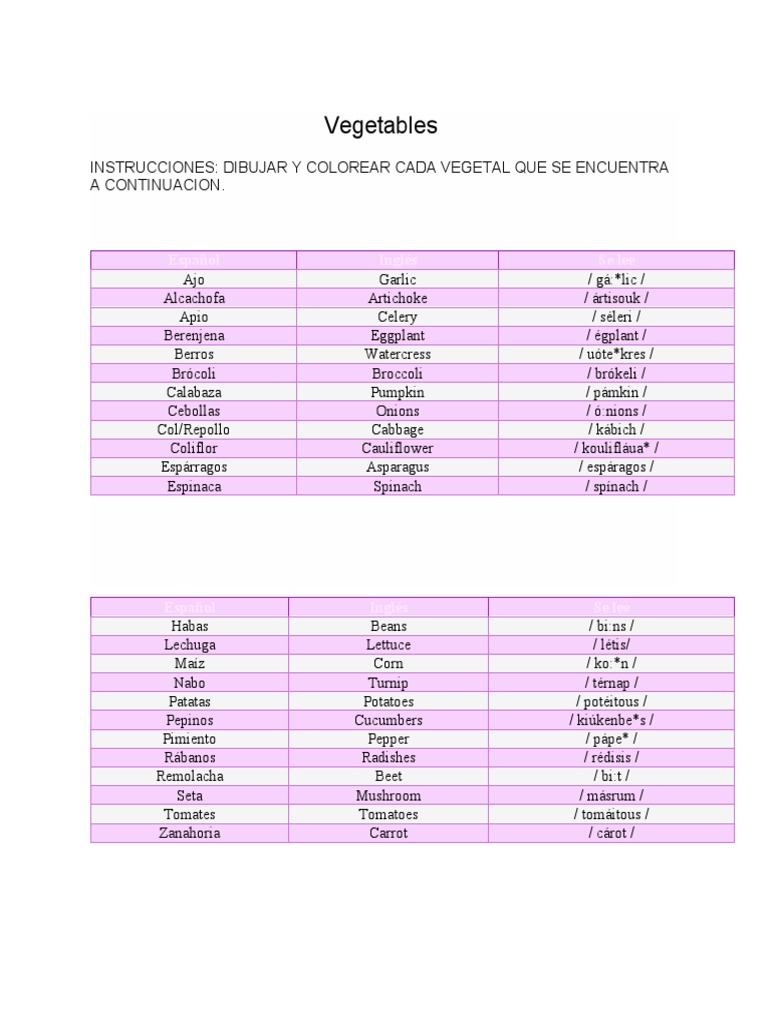 Vegetables en Ingles y Español PDF
