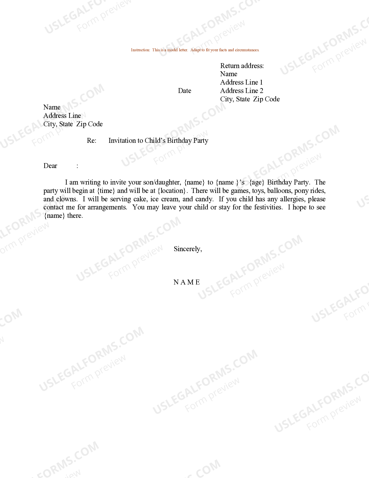 Tennessee Sample Letter for Invitation to Child's Birthday Party