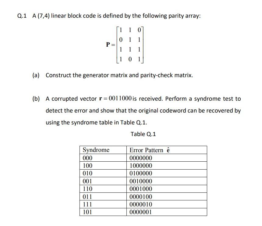 Solved Q.1 A (7,4) linear block code is defined by the