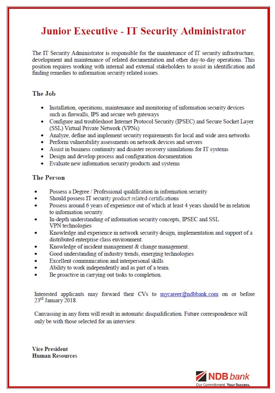 Junior Executive IT Security Administrator at National Development Bank