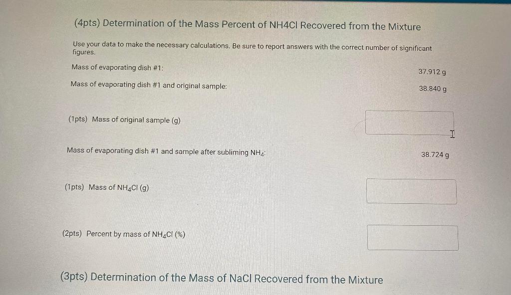 Solved (4pts) Determination of the Mass Percent of NH4Cl Mass Of Evaporating Dish After Subliming Nh4Cl You put the filter paper (mass. After drying the filtrate, the mass of the evaporating dish, watch glass, and salt is 74.2157g. To find the mass of the original sample, subtract the mass of the evaporating dish from the mass of the evaporating dish and. The data given in this question is the mass of evaporating dish 1: We first. Mass Of Evaporating Dish After Subliming Nh4Cl.