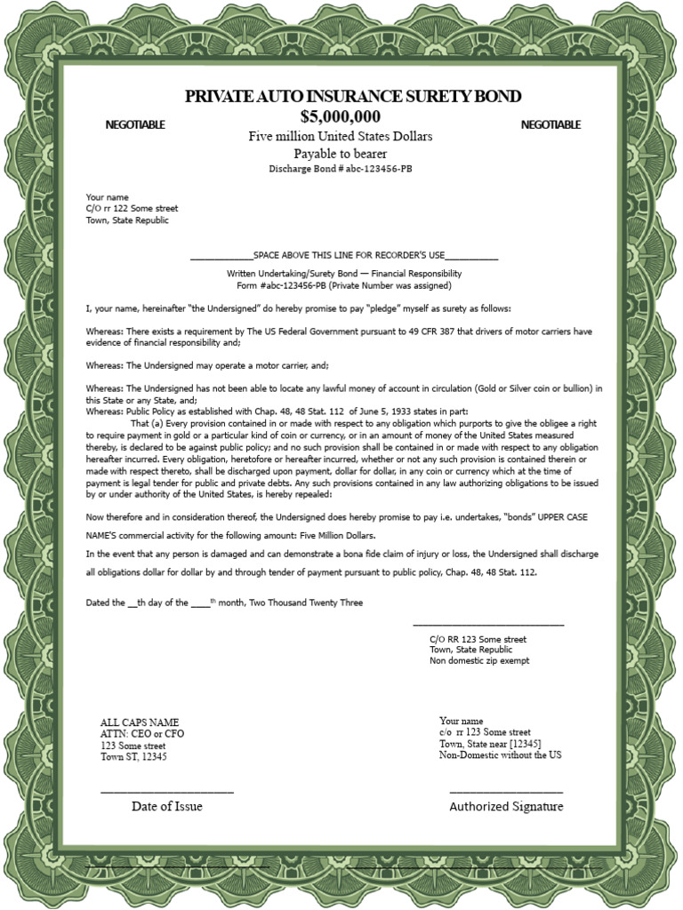 Car Insurance Bond PDF United States Dollar Legal Tender
