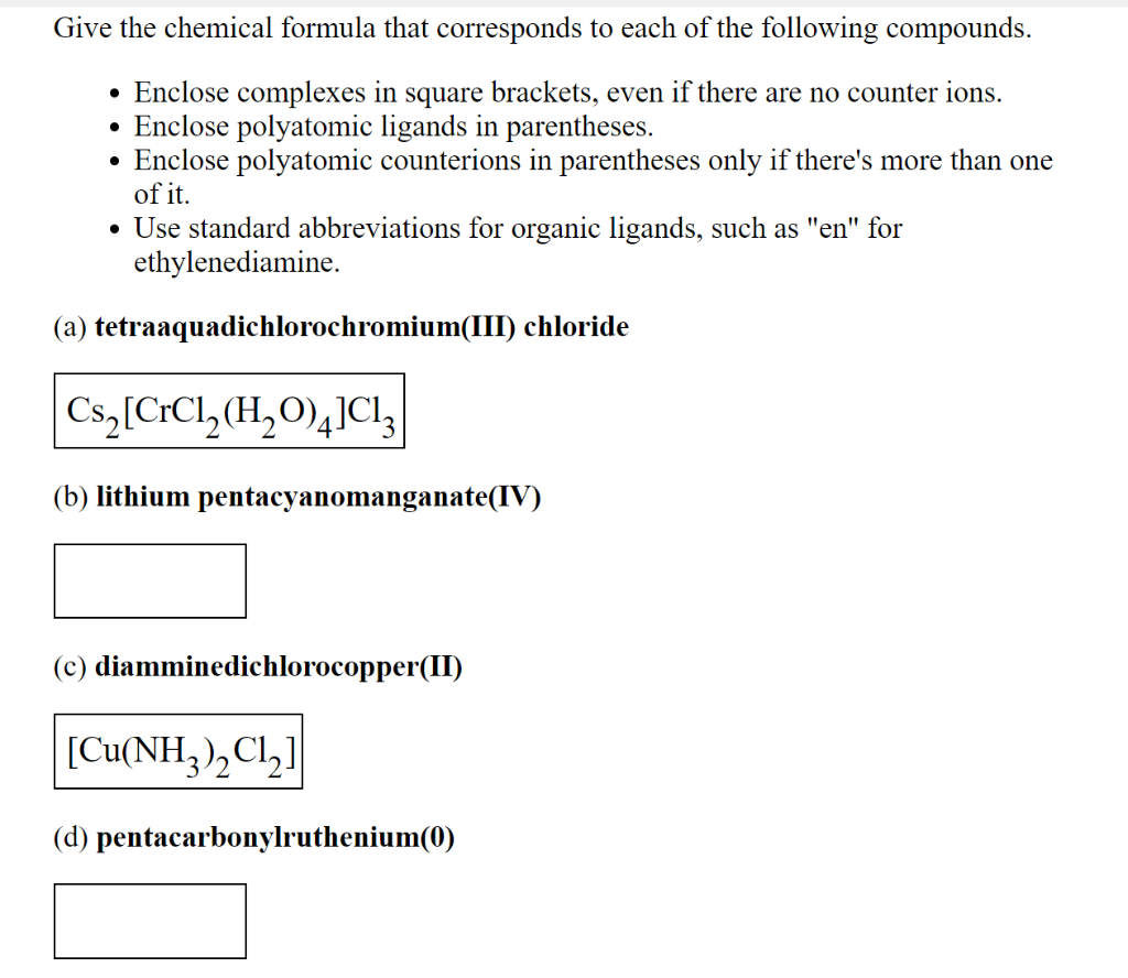 Solved Give the chemical formula that corresponds to each of Brackets In Chemistry Solid (s), liquid (l), gas (g), or. The symbol for molarity is \(\text{m}\) or moles/liter. Without the bracket, the structure would be written ch3coch2ch3, which might be confused for an ether. If there’s more than one complex ion in the compound, then brackets are needed. In this context, the brackets means #concentration#. The reason is that you need to put. Brackets In Chemistry.