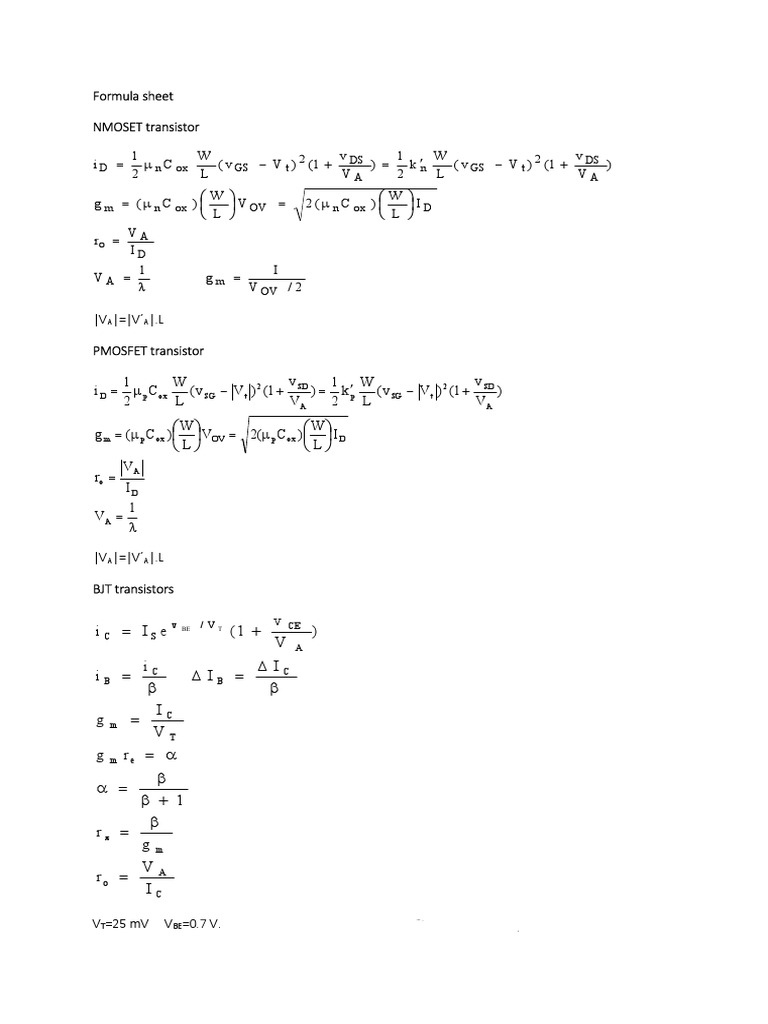 Transistor Formulas Cheat Sheet Transistor Formula Sheet Equations are for the npn bjt. bipolar transistors are current regulating devices that control the amount of current flowing through them in proportion to the. \transfer resistor when bell labs had an informal contest to name their new invention, one engineer pointed out that it acts like a resistor, but a. transistor and amplifier formulas the following formulas. Transistor Formula Sheet.