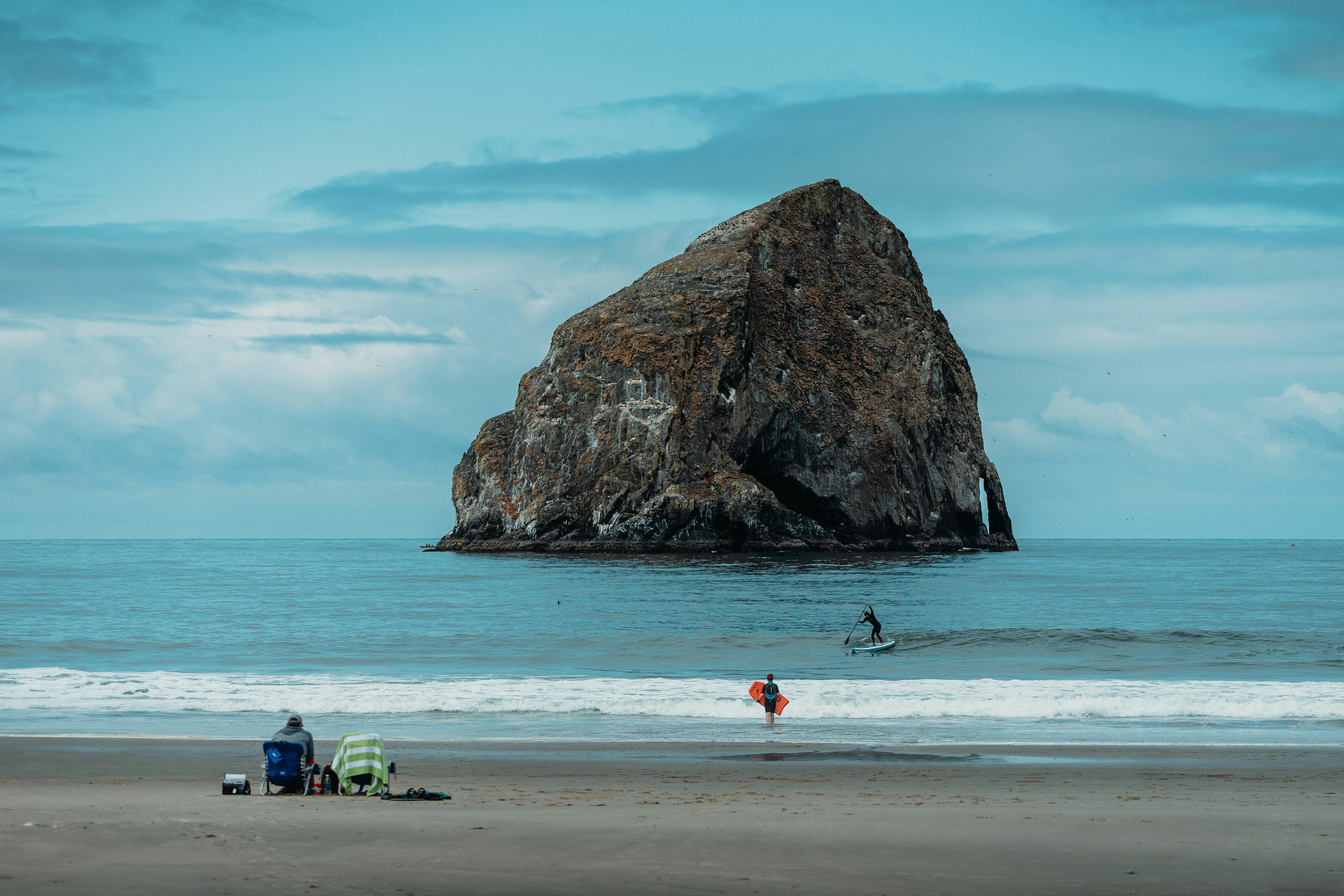 A large rock sitting on top of a beach next to the ocean photo Free