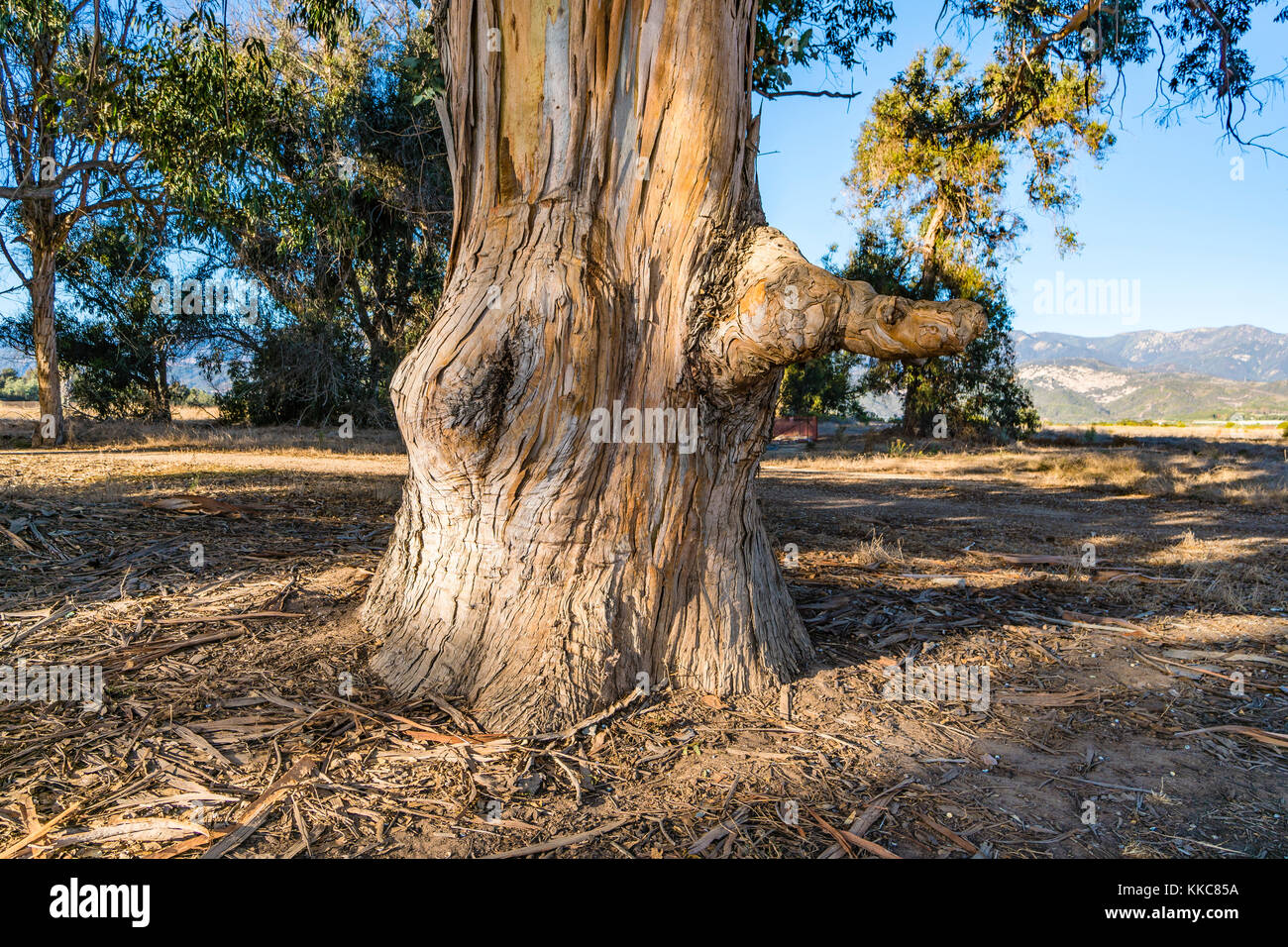 Gnarled eucalyptus tree trunk with rough and peeling bark, Carpinteria