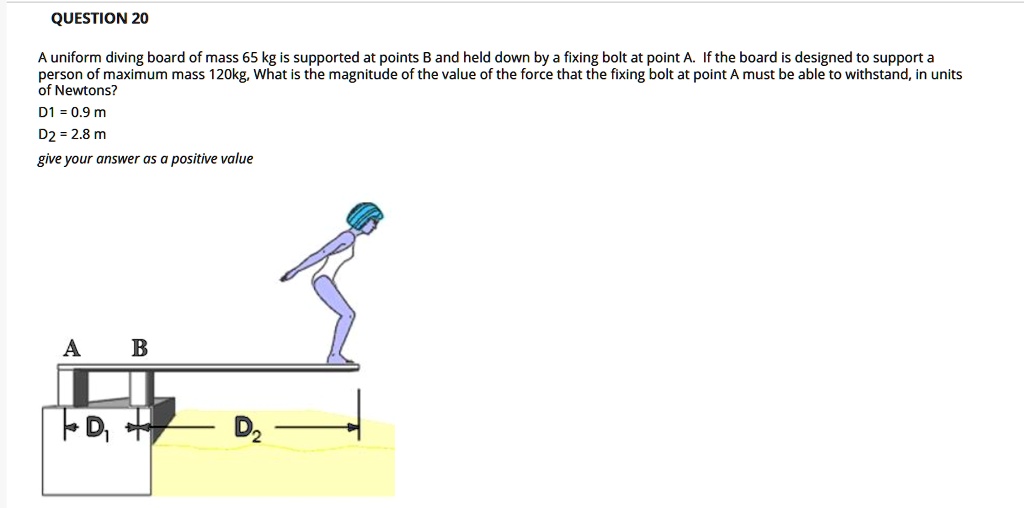 QUESTION 20 A uniform diving board of mass 65 kg is supported at points B and held down by A Uniform Diving Board Has The uniform diving board has a mass of 30 kg. The uniform diving board has a mass of 28 kg. A diving board is a structure used for diving into a body of water. The acceleration of gravity is 9.81 m/s2. Find the force on support a when a 72 kg diver stands at the end of the diving board.. A Uniform Diving Board Has.