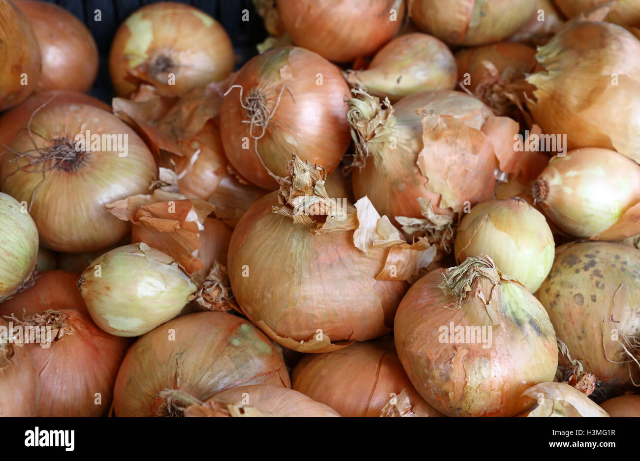 Fresh common bulb onion on retail store market fruit display, close up, high angle view Stock
