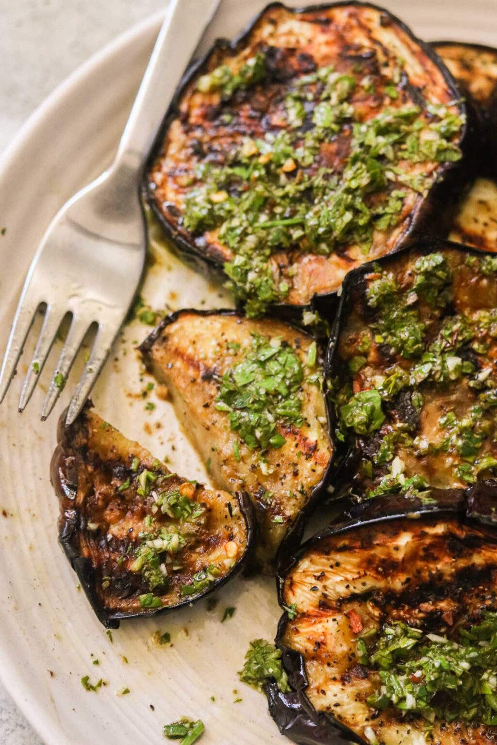 grilled eggplant and potatoes in a white dish with a fork on the side Grilled Eggplant With Chimichurri This grilled eggplant with chimichurri recipe is a quick, flavorful culinary delight. 1 large eggplant, or 2 medium cut in half moons (thick enough to stand up on skin side) 1/2 tsp salt. Crispy, chewy, delicious eggplant is the perfect side for any grilled meat, and it only takes a few easy steps. Perfect for a paleo dinner! The goal. Grilled Eggplant With Chimichurri.