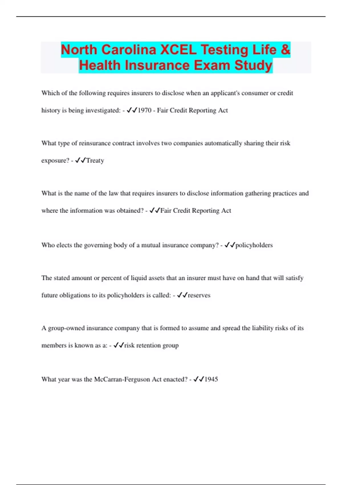 North Carolina XCEL Testing Life & Health Insurance Exam Study North Carolina XCEL Testing