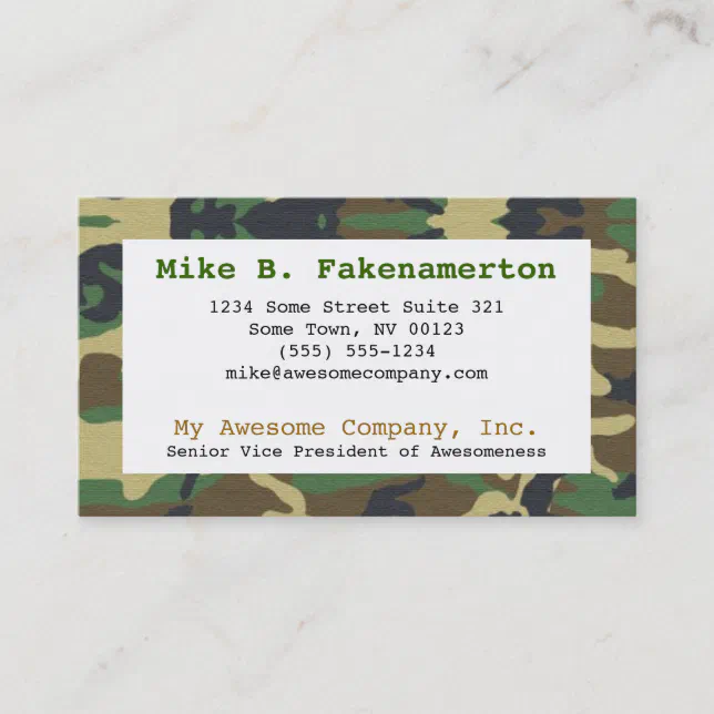 Woodland camouflage business card Zazzle Camouflage Business Cards Customise the design including colors, fonts and layout in seconds. Camouflage business cards are a great way to showcase your personality and stand out from the crowd. Make your mark with camouflage business cards. Choose from a range of templates and designs or create your own today. Our wide range of camouflage patterns. Check out our camouflage business cards selection. Camouflage Business Cards.
