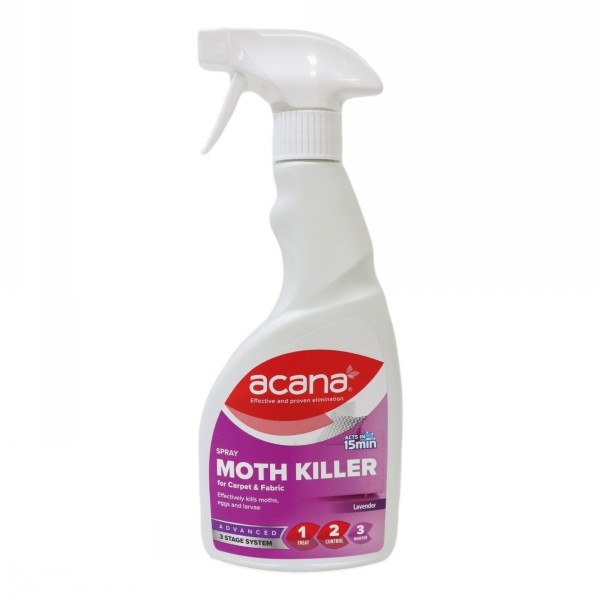 Acana Carpet and Fabric Moth Killer with Lavender Freshener Spray 500 Acana Moth Killer Spray 500Ml Apply 20ml per square metre. This 500ml spray not only eliminates moths but also leaves your space smelling fresh. Suitable for carpets, soft furnishings, curtains, cushions and other fabrics. This highly effective licensed insecticide kills moths, eggs and larvae giving you a moth free home. Suitable for carpets, soft furnishings, curtains, cushions and other fabrics. It is recommended to treat. Acana Moth Killer Spray 500Ml.