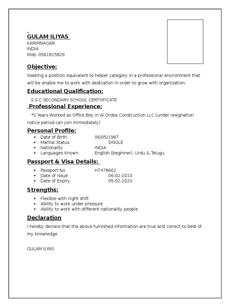 RESUME OFFICE BOY