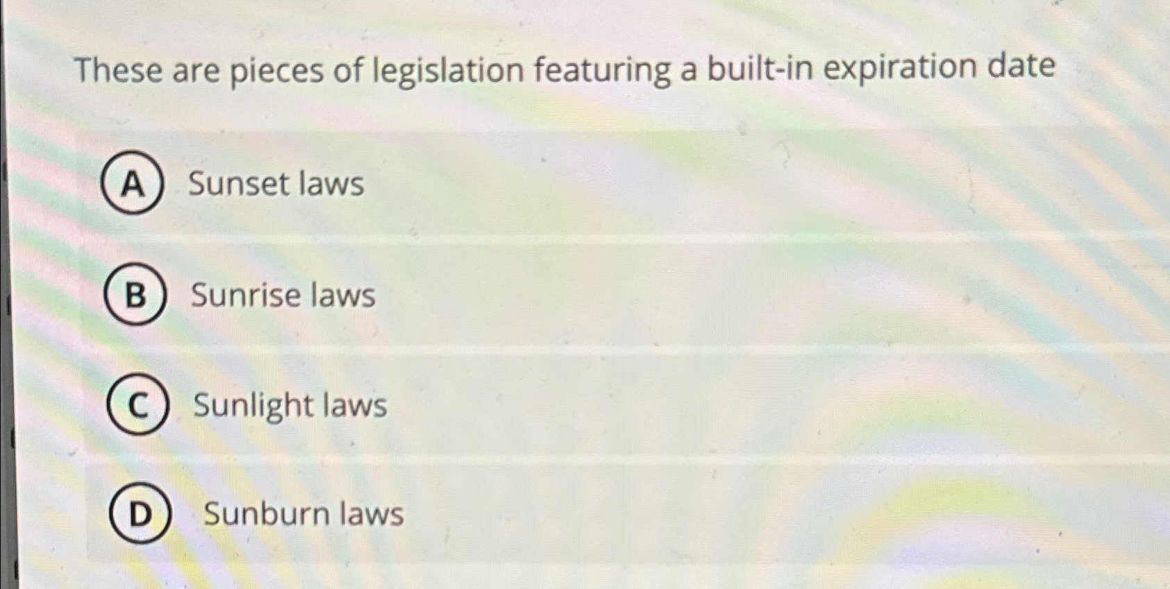 Solved These are pieces of legislation featuring a builtin What Is A Sunset Law Quizlet Sunset provisions can help prevent outdated laws from remaining in effect indefinitely, ensuring that legislation remains relevant and effective. What is a sunset law? A sunset law is a rule or regulation that is set to expire after a certain period unless it is renewed or extended. A sunset clause is a provision in a law, contract, or regulation that. What Is A Sunset Law Quizlet.