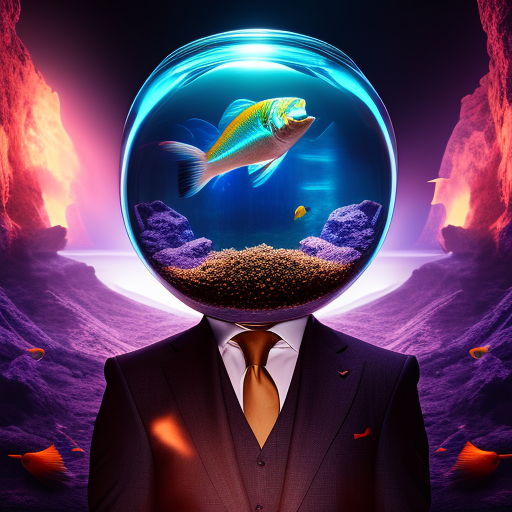 voogla a man in a suit with no head, ((a fish bowl)) on shoulders