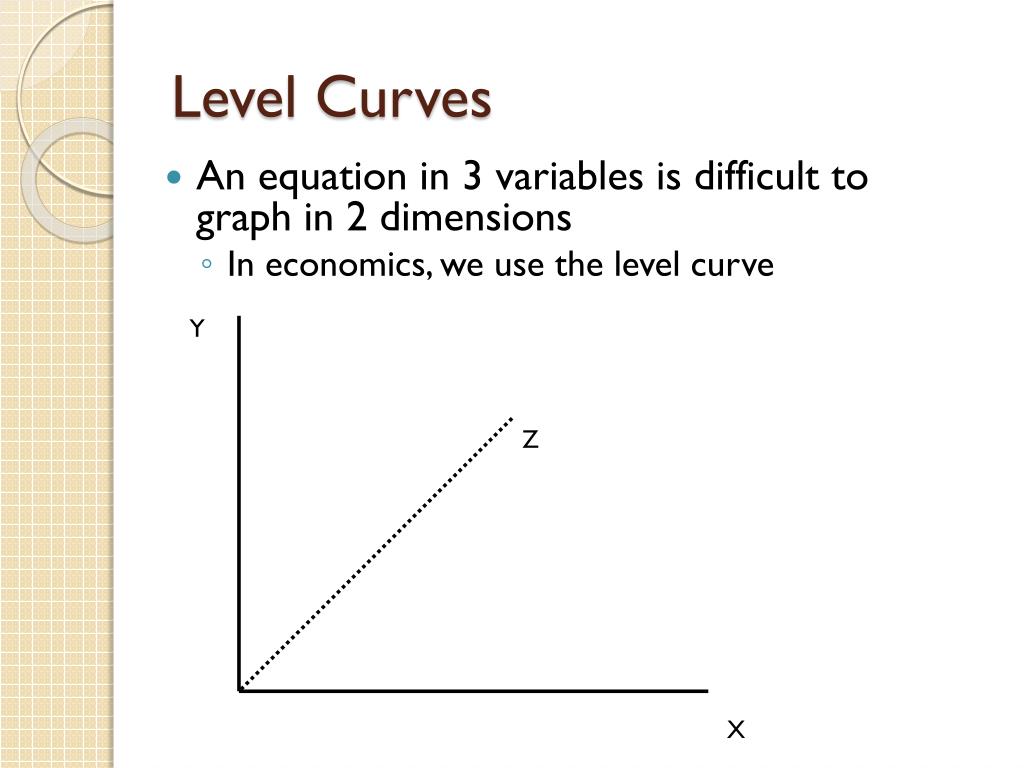PPT Chapter 14 Partial Derivatives PowerPoint Presentation, free Level Curve Definition The next topic that we should look at is that of level curves or contour curves. Given a function [latex]f\,(x,\ y)[/latex] and a number [latex]c[/latex] in the range of [latex]f[/latex], a level curve of a function of two variables for the value [latex]c[/latex] is defined. Recall that the level curves of a function \(f(x, y)\) are the curves given by. Level Curve Definition.