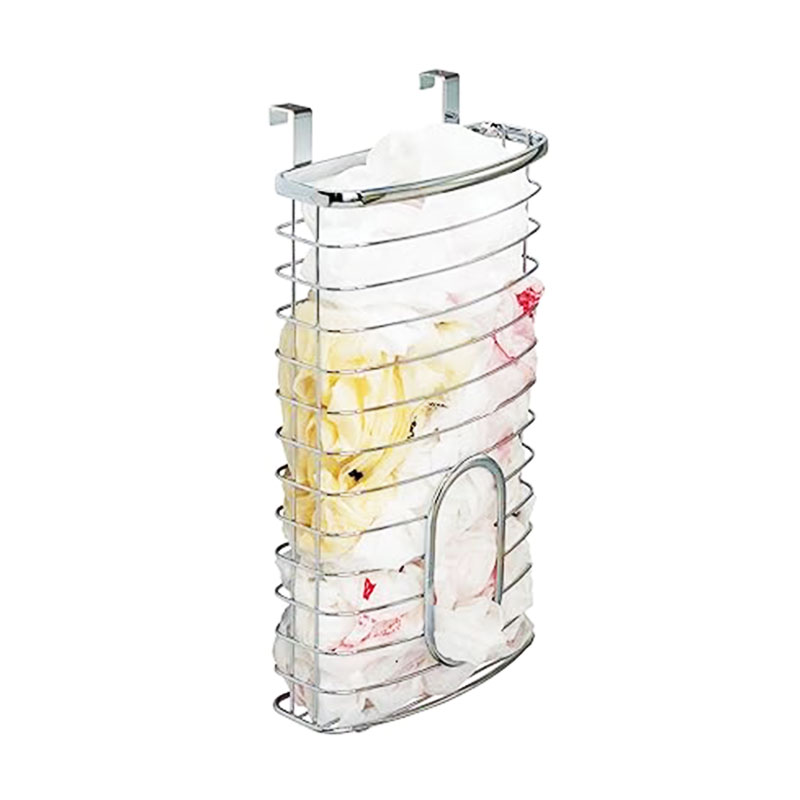 Over Cabinet Bag Holder Securely fits over any cabinet door in the kitchen, bath. Securely fits over any cabinet door in the kitchen, bath. Simply hang from a cabinet door for instant storage. Wire over the cabinet storage basket is perfect to store all your plastic bags, garbage bags,. Measurements:8 w x 3.75 d x 15.75 h. This is the perfect solution for. Easily installs with no mounting hardware. The interdesign axis over the cabinet bag holder will instantly organize plastic bags. Durable metal composition and chrome plated slats making it rust resistant. Keep bags stored at hands reach in this metal over the cabinet bag holder. The holder offers a large hole for easy grabs and ample space to keep plenty of.