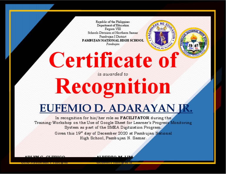 JUNE 2 Dep Ed Template Certificate Of Recognition A4Size TEMP NOSignature Republic of the Sample Certificate Of Appreciation For Facilitator We collected 26 free certificate of appreciation templates and great appreciation letter samples. The certificate of appreciation is a formal certificate that recognizes an individual’s or group’s achievements in a specific skill, course, or event. The document is a certificate of appreciation from the department of education in the philippines recognizing an individual for their meritorious performance as a facilitator.. Sample Certificate Of Appreciation For Facilitator.